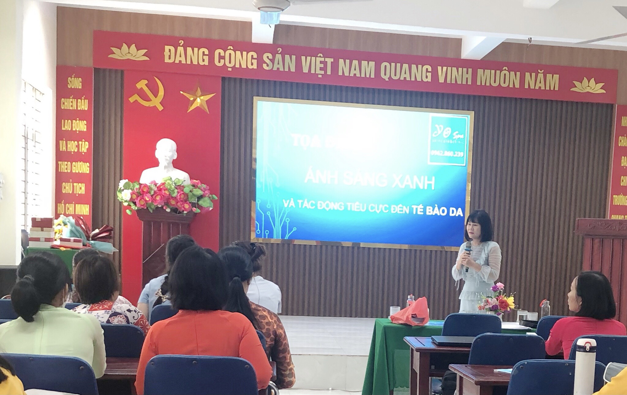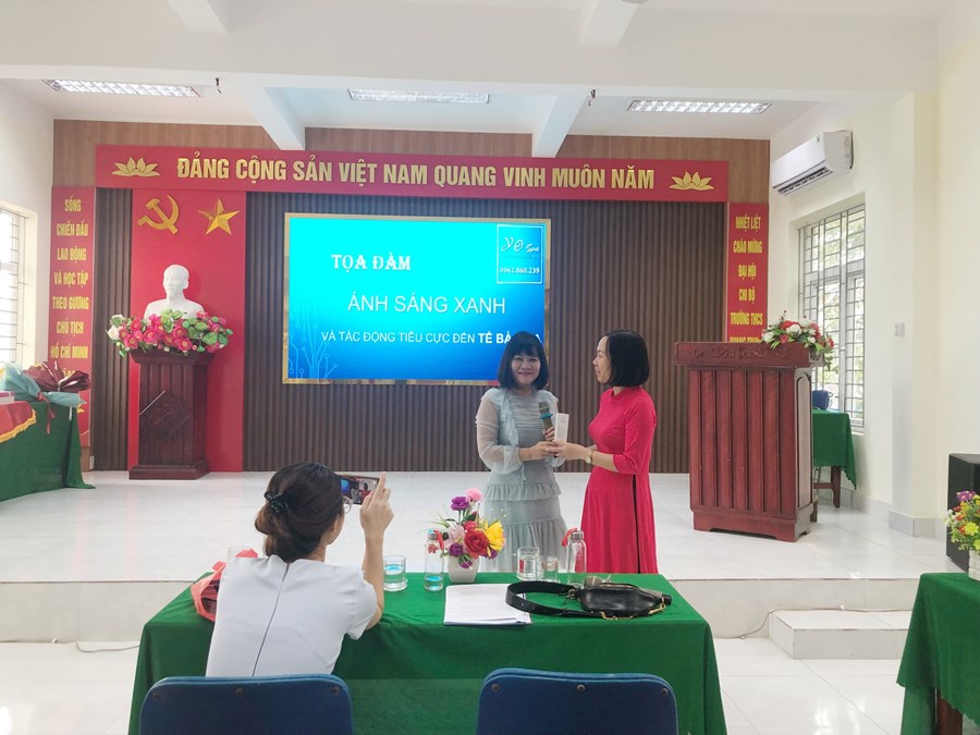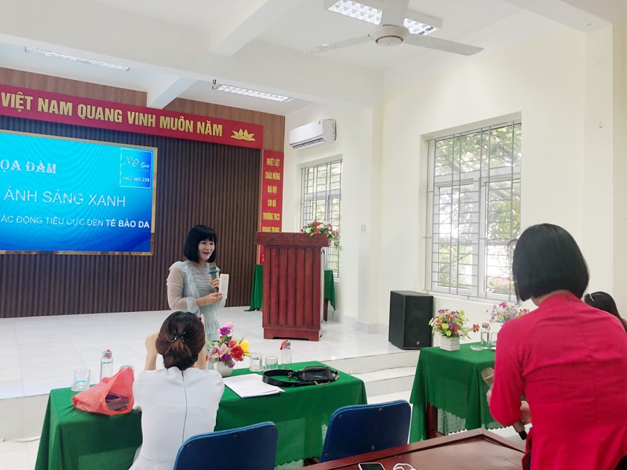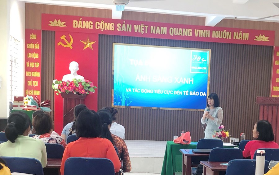 Trong buổi tọa đàm, đoàn viên Công đoàn nhà trường đã được ôn lại truyền thống, ý nghĩa ngày Phụ nữ Việt Nam. Công đoàn nhà trường đã mời chuyên gia chăm sóc, làm đẹp có uy tín tại địa bàn quận Ngô Quyền cùng trao đổi, hướng dẫn các nữ đoàn viên Công đoàn về tác hại của ánh sáng xanh đối với làn da. Ngày nay cùng phát triển công nghệ thời gian gần đây chúng ta tiếp xúc với các thiết bị có phát ra ánh sáng xanh ngày càng nhiều hơn cả ngày lẫn đêm. Thậm trí có rất nhiều người theo thói quen tỉnh ngủ lúc nửa đêm theo phản xạ cầm ngay vào điện thoại. Trong lúc này lượng ánh sáng phát ra tuy không nhiều và không gây khó chịu, nhưng lâu dài thì cũng bị ảnh hưởng đáng kể.