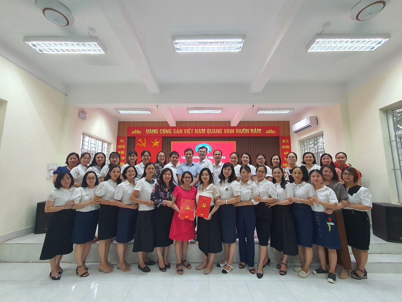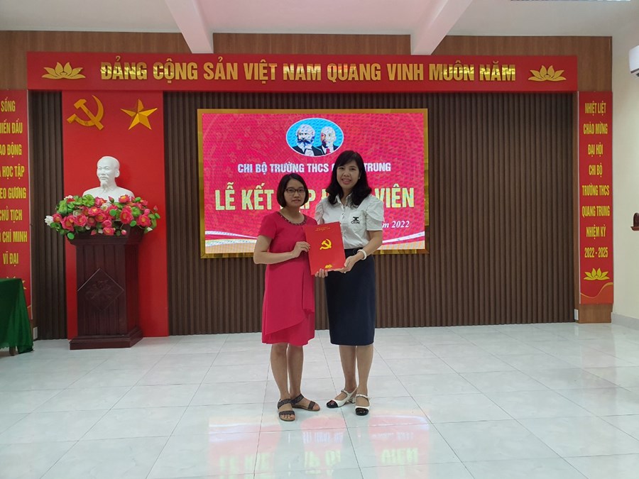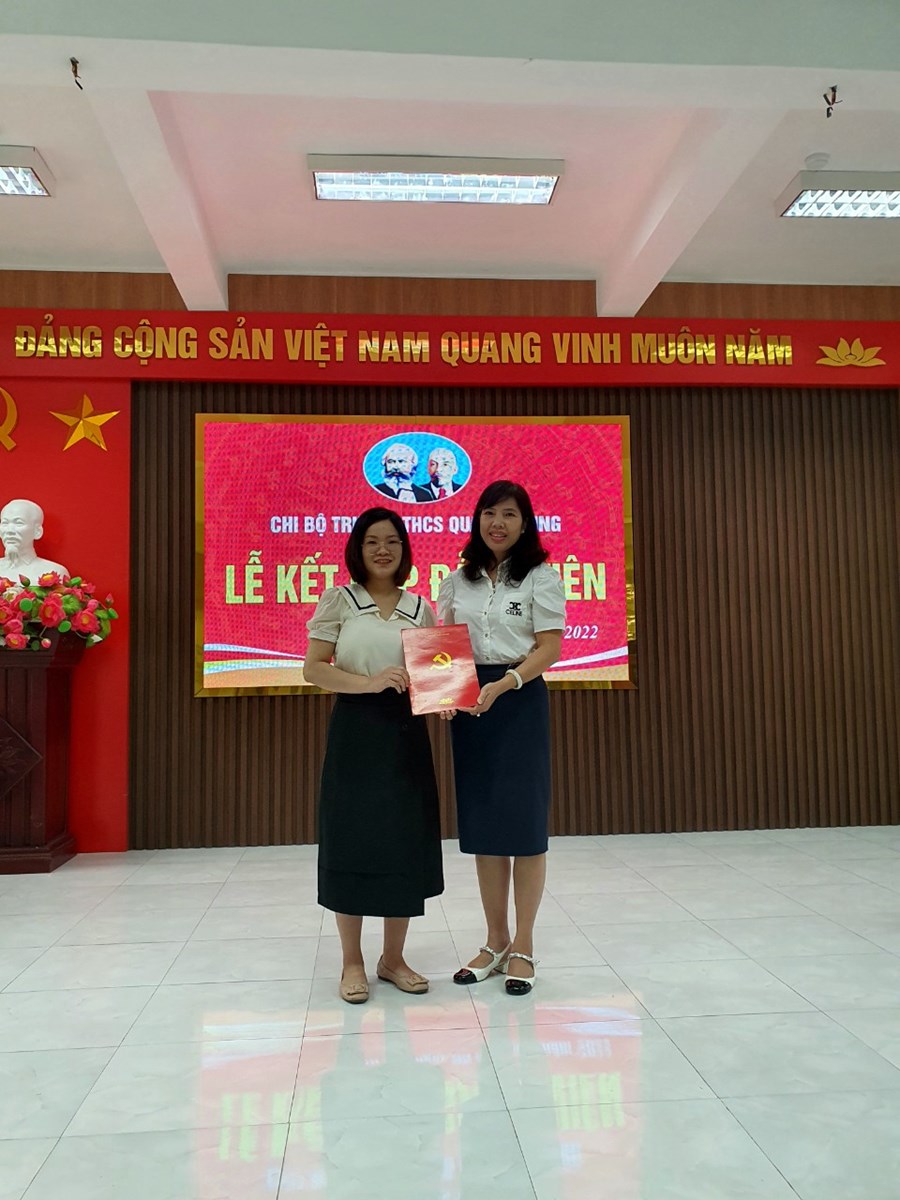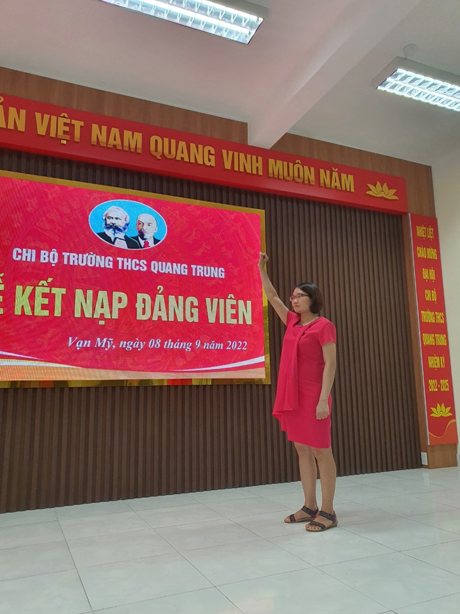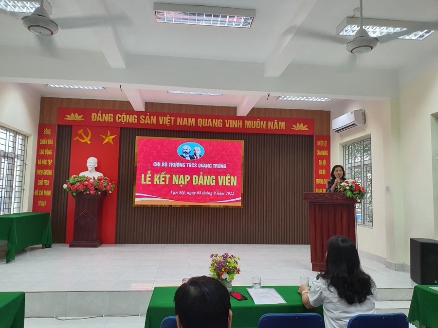 Vào 16h ngày 08/9/2022 được sự đồng ý của Đảng ủy phường Vạn Mỹ, Chi bộ trường THCS Quang Trung tổ chức Lễ kết nạp quần chúng Đặng Thị Mơ và Vũ Thị Hoa vào Đảng theo Quyết định của Ban Thường vụ Quận ủy Ngô Quyền.