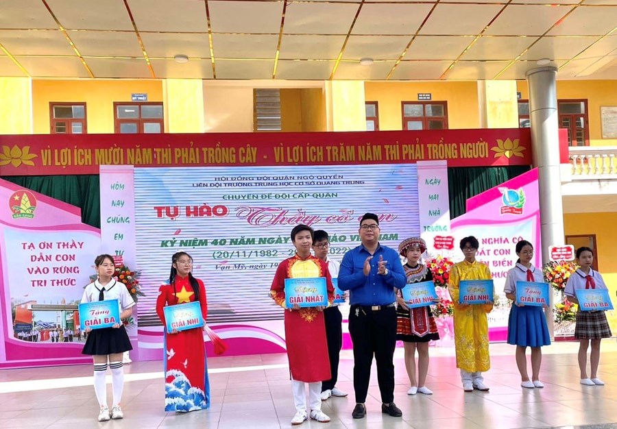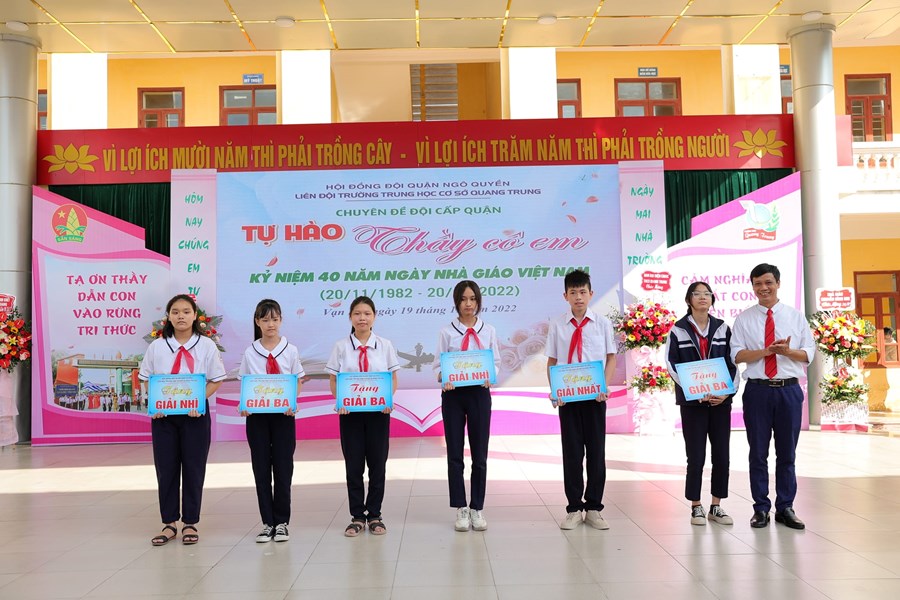 Chương trình còn tổng kết, phát thưởng cho các chi đội đã đạt được thành tích cao trong cuộc thi báo tường, thi văn nghệ với chủ đề: Thầy cô trong trái tim em.