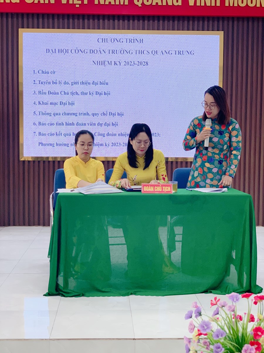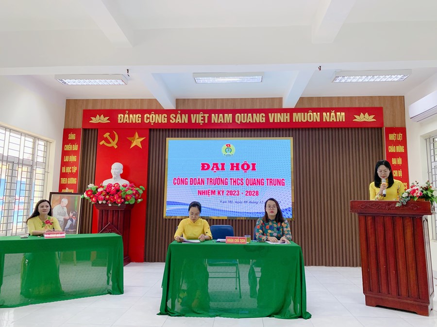 Đại hội đã bầu Ban chấp hành Công đoàn nhiệm kỳ 2023- 2028 gồm 5 đồng chí, để tiếp tục lãnh đạo phong trào CNVC-LĐ và hoạt động Công đoàn nhà trường. BCH Công đoàn trường THCS Quang Trung khoá mới đã ra mắt và nhận nhiệm vụ trước Đại hội.