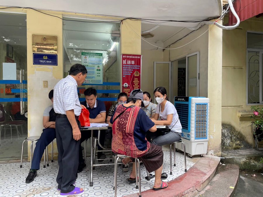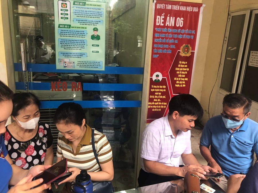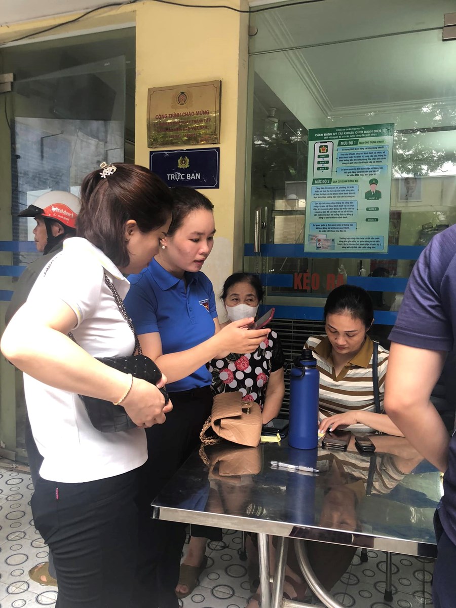 Thực hiện đề án 06/QĐ-TTg của Thủ tướng Chính phủ v/v phát triển ứng dụng dữ liệu về dân cư, định danh và xác thực điện tử phục vụ chuyển đổi số quốc gia giai đoạn 2022-2025, các thầy cô giáo trường THCS Quang Trung tích cực hỗ trợ, hướng dẫn nhân dân phường Vạn Mỹ cài đặt, kích hoạt tài khoản VNeID - tài khoản định danh điện tử mức 1 và mức 2.