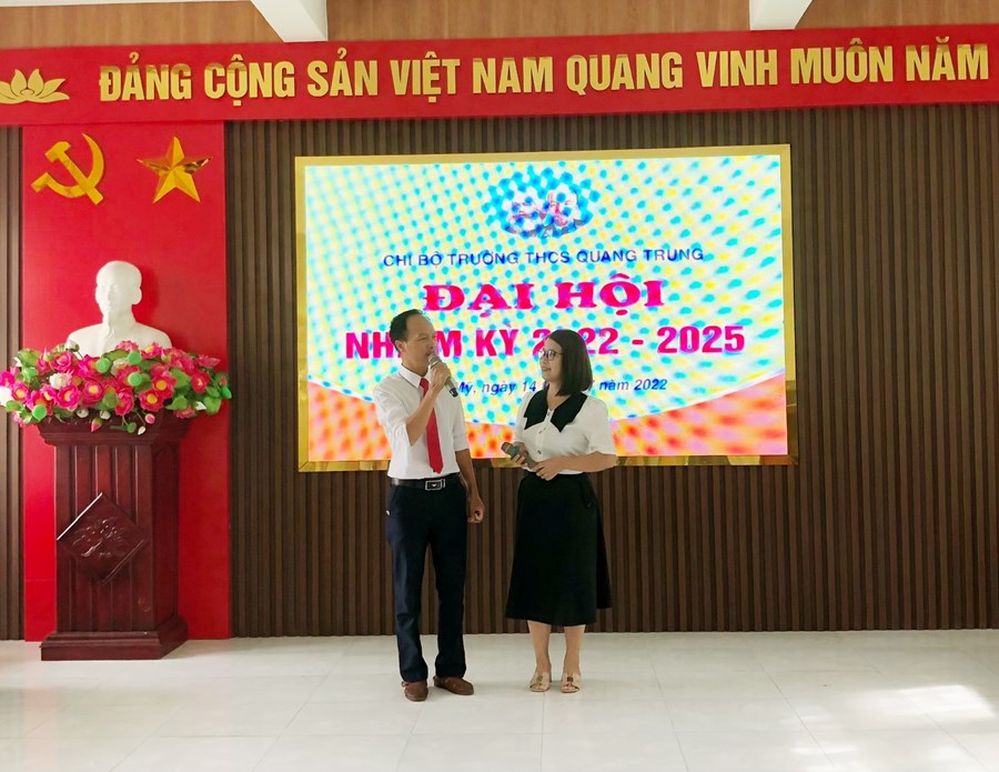 Đồng chí Vũ Hoa Huệ -–Bí thư chi bộ- Hiệu trưởng nhà trường đã thông qua bản kiểm điểm của Chi ủy chi bộ nhiệm kỳ 2020-2022 và trình bày mục tiêu, chỉ tiêu, nhiệm vụ và giải pháp của chi bộ trường THCS Quang Trung nhiệm kì 2022-2025. Đại hội cũng được nghe ý kiến tham luận của đồng chí đảng viên Hoàng Thị Thu Hằng - Tổ trưởng tổ KHXH và đồng chí đảng viên Phan Thị Hằng - Chủ tịch công đoàn về vấn đề tổ chuyên môn với công tác phát triển Đảng viên, chi bộ chỉ đạo các hoạt động đoàn thể. Các ý kiến tham luận đều thể hiện sự tập trung, đóng góp trí tuệ vào các giải pháp thực hiện nhiệm vụ lãnh đạo trong nhiệm kỳ 2022-2025 nhằm xây dựng chi bộ vững mạnh, hoàn thành xuất sắc mọi nhiệm vụ.