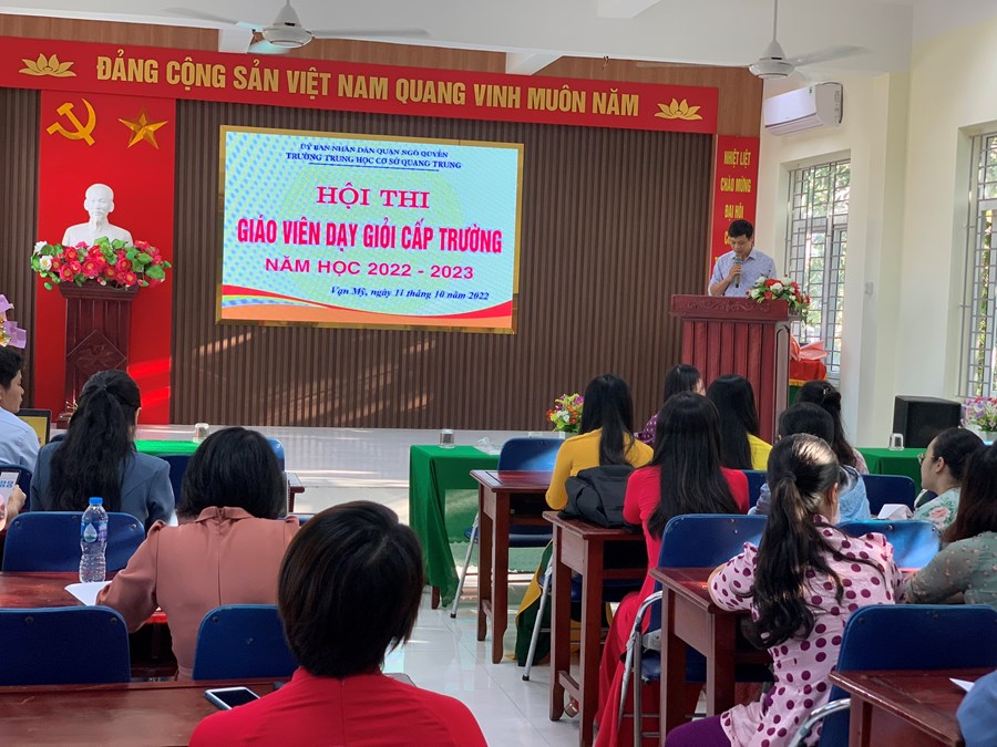 Thực hiện KH năm học 2022-2023, hướng ứng phong trào “Thi đua dạy tốt – học tốt” chào mừng kỉ niệm 92 năm ngày Phụ nữ Việt Nam 20/10; được sự chỉ đạo của Ban Giám hiệu nhà trường về việc đẩy mạnh phong trào thi đua dạy tốt - học tốt, nhằm động viên, tạo cơ hội cho giáo viên rèn luyện, tự học và sáng tạo. Qua đó công nhận và suy tôn giáo viên đạt danh hiệu giáo viên dạy giỏi cấp trường, tạo điều kiện để giáo viên thể hiện kỹ năng nghề nghiệp, học tập, trao đổi kinh nghiệm về giảng dạy, tổ chức lớp học; khai thác sử dụng sáng tạo, hiệu quả phương tiện, đồ dùng dạy học. Hội thi là một trong những căn cứ để đánh giá thực trạng đội ngũ, từ đó xây dựng kế hoạch đào tạo, bồi dưỡng nhằm nâng cao trình độ chuyên môn, nghiệp vụ cho giáo viên, đáp ứng yêu cầu đổi mới giáo dục và triển khai thực hiện thành công Chương trình giáo dục phổ thông 2018.