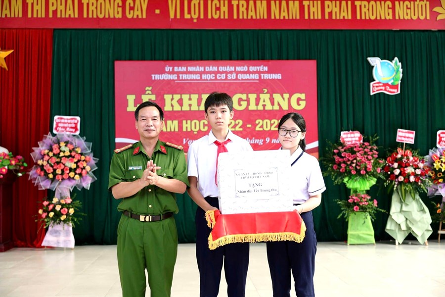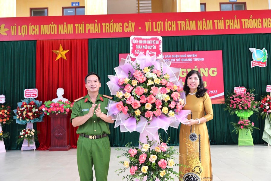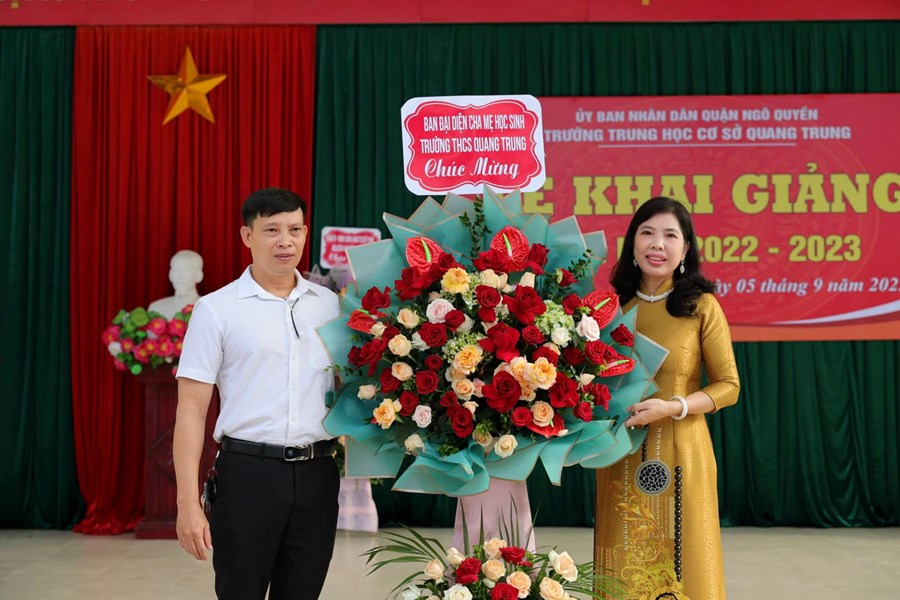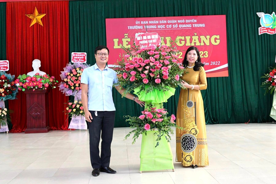 Nhân dịp này, thay mặt lãnh đạo Quận uỷ - HĐND - UBND - Ủy ban MTTQ Việt Nam Quận Ngô Quyền, đồng chí Nguyễn Đình Xoang đã tặng hoa chúc mừng nhà trường và quà Trung thu cho các em học sinh.
