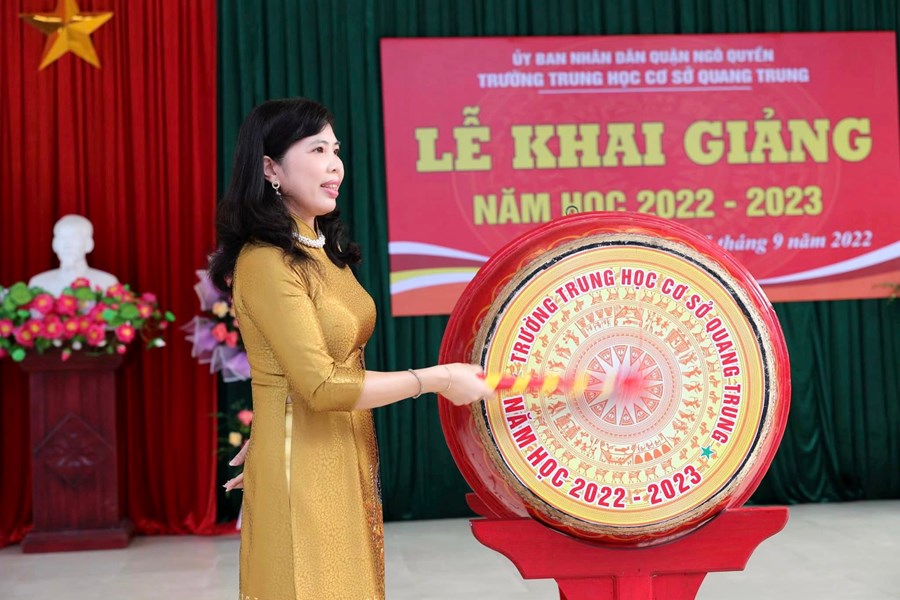 Cô giáo Vũ Hoa Huệ, Bí thư Chi bộ- Hiệu trưởng nhà trường phát biểu diễn văn và đánh trống khai trường.