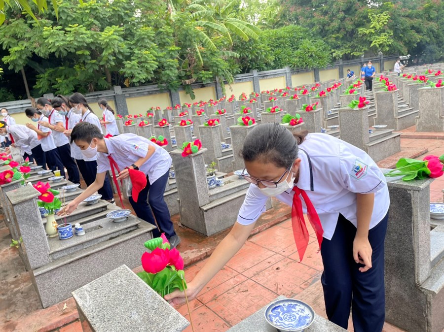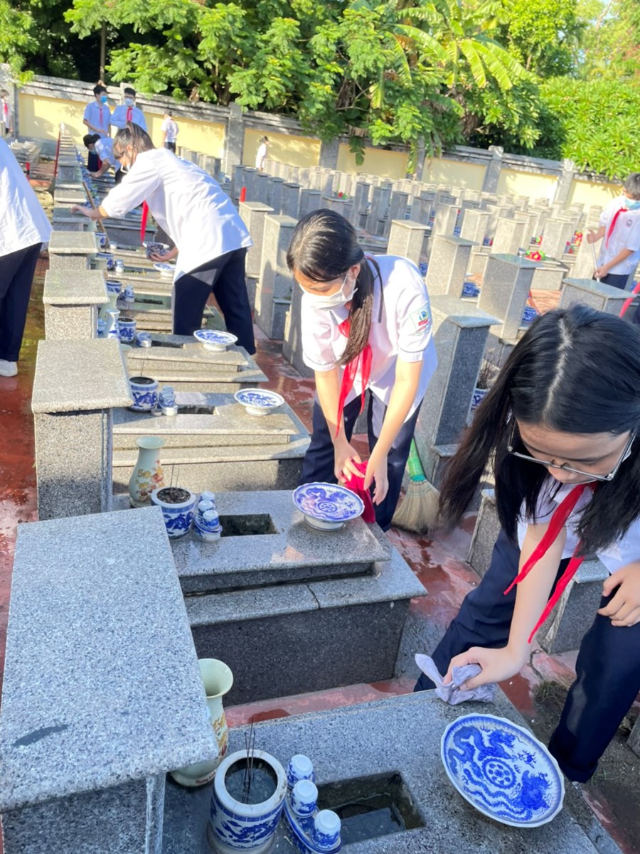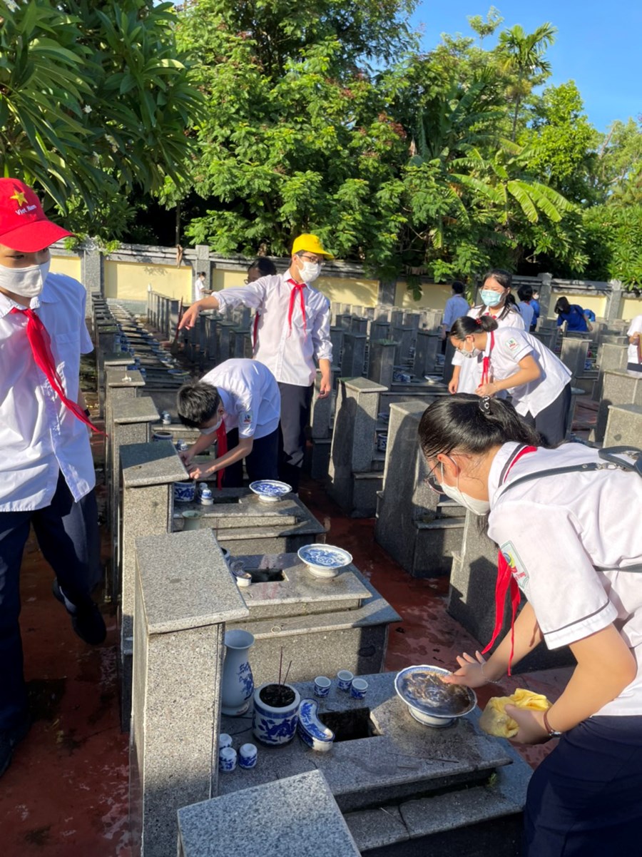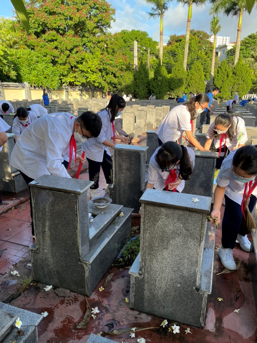 Nhân dịp kỷ niệm 75 năm Ngày Thương binh - Liệt sĩ (27/7/1947-27/7/2022), sáng ngày 16/7/2022, đại diện BCH Chi đoàn giáo viên và các em học sinh đại diện Liên đội THCS Quang Trung đã dâng hương tại Đài tưởng niệm Bác Hồ và Đài tưởng niệm các anh hùng liệt sĩ quận Ngô Quyền; tham gia dọn dẹp cảnh quan, thắp hương, dâng hoa tại các phần mộ liệt sĩ.