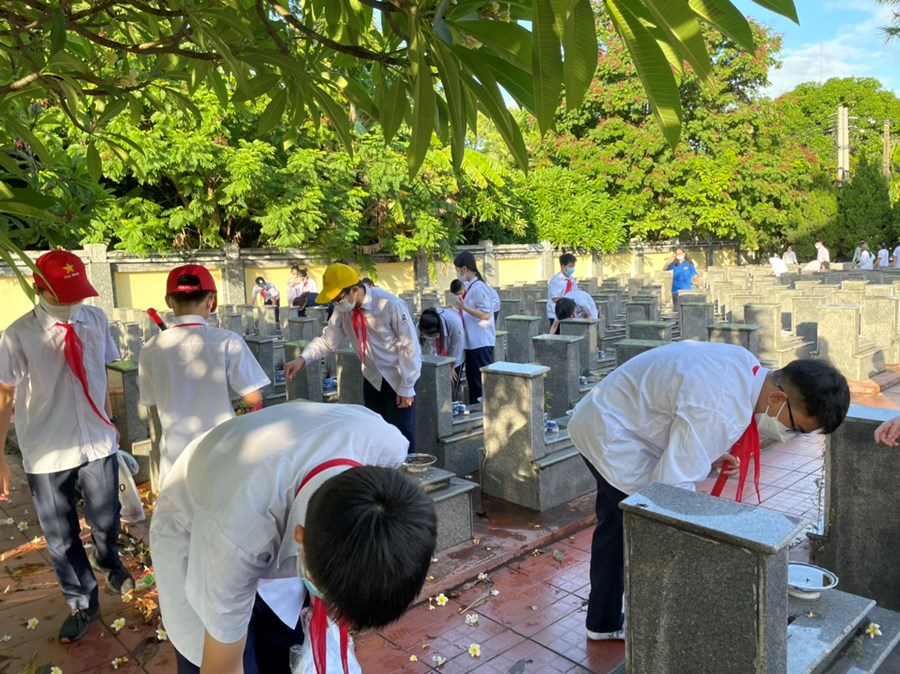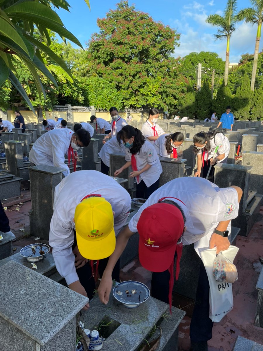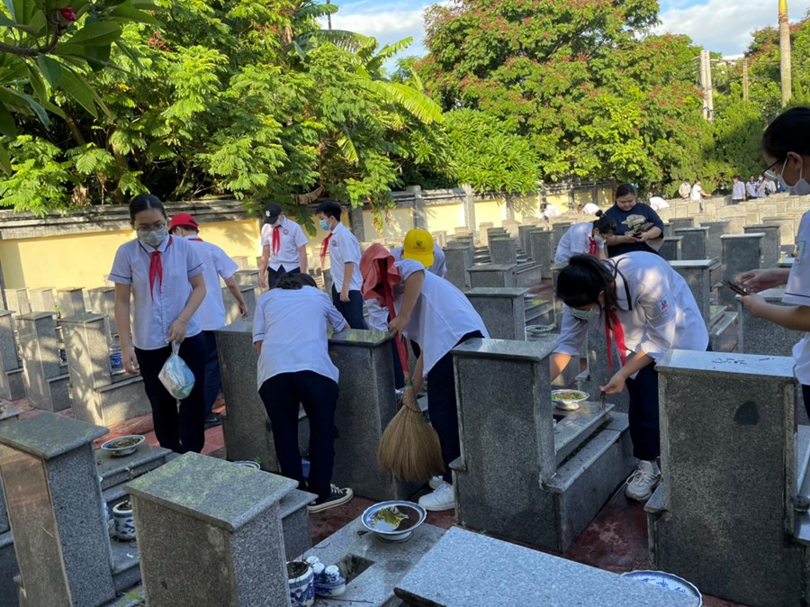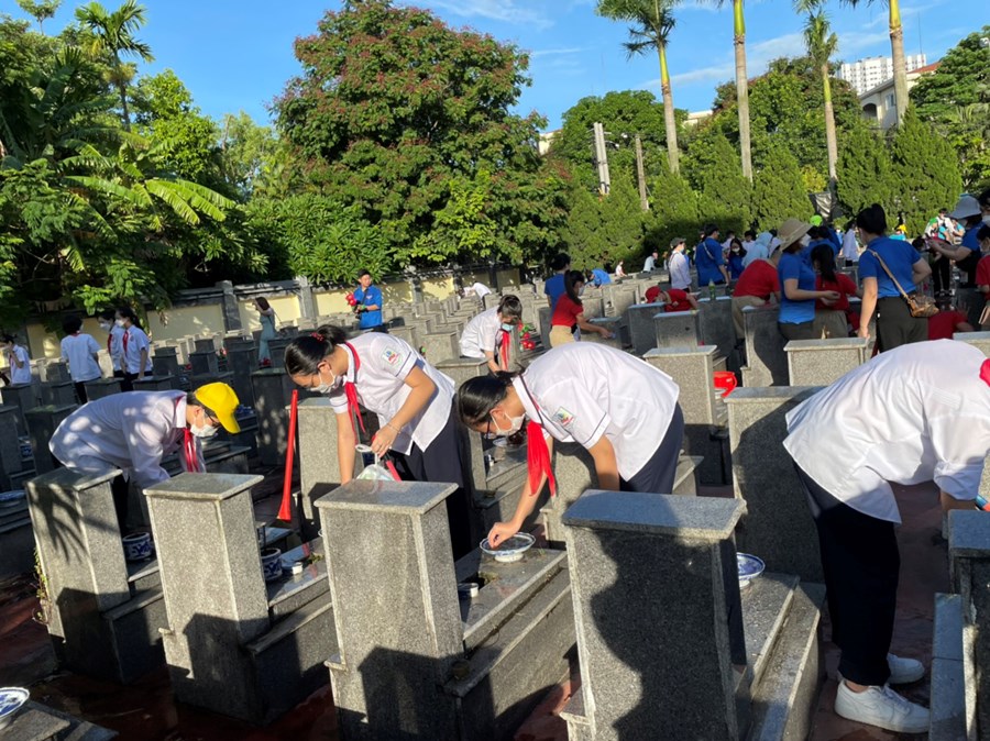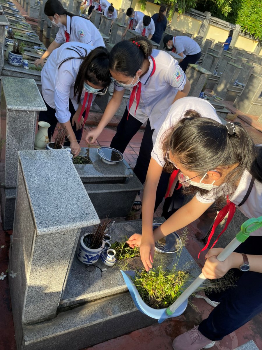 Nhân dịp kỷ niệm 75 năm Ngày Thương binh - Liệt sĩ (27/7/1947-27/7/2022), sáng ngày 16/7/2022, đại diện BCH Chi đoàn giáo viên và các em học sinh đại diện Liên đội THCS Quang Trung đã dâng hương tại Đài tưởng niệm Bác Hồ và Đài tưởng niệm các anh hùng liệt sĩ quận Ngô Quyền; tham gia dọn dẹp cảnh quan, thắp hương, dâng hoa tại các phần mộ liệt sĩ.