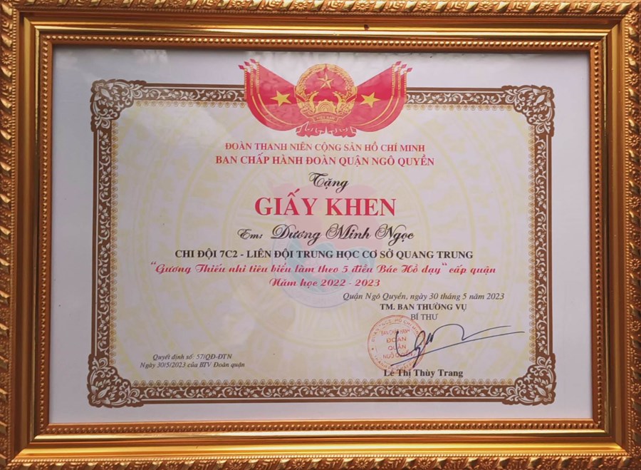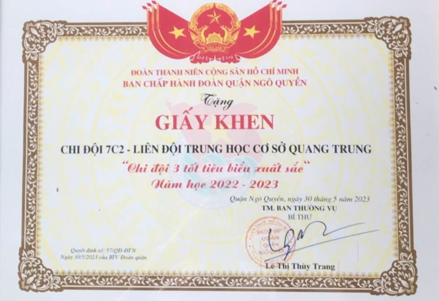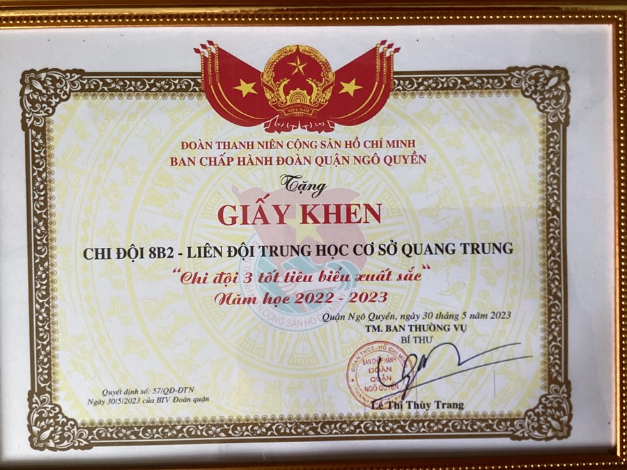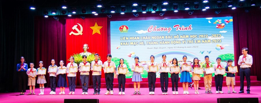 Sáng ngày 3/6, tại 02 Liên hoan Cháu ngoan Bác Hồ cấp Quận năm học 2022-2023, Chi đội và 02 đội viên thuộc Liên đội đã được biểu dương khen thưởng: