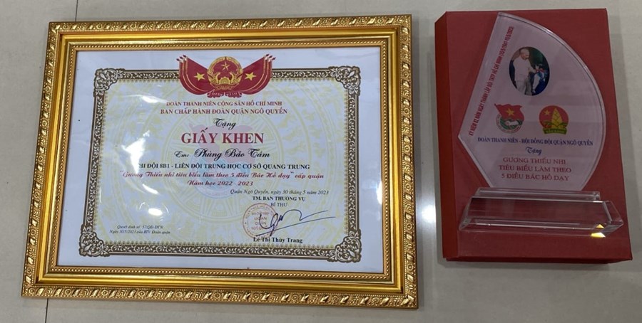 Chúc mừng em Phùng Bảo Tâm - Liên đội trưởng, Chi đội trưởng Chi đội 8B1 và em Dương Minh Ngọc - Liên đội phó, Chi đội trưởng Chi đội 7C2 đã đạt danh hiệu " Gương thiếu nhi tiêu biểu" cấp quận.
