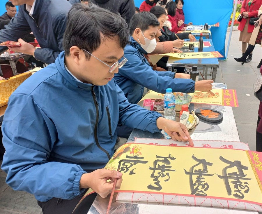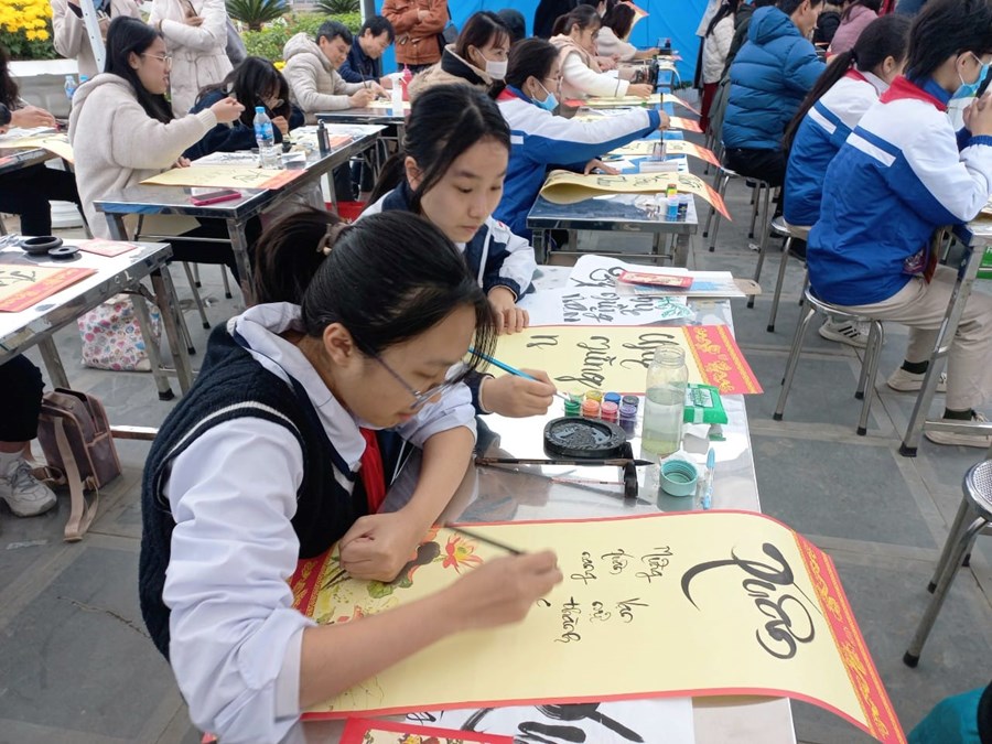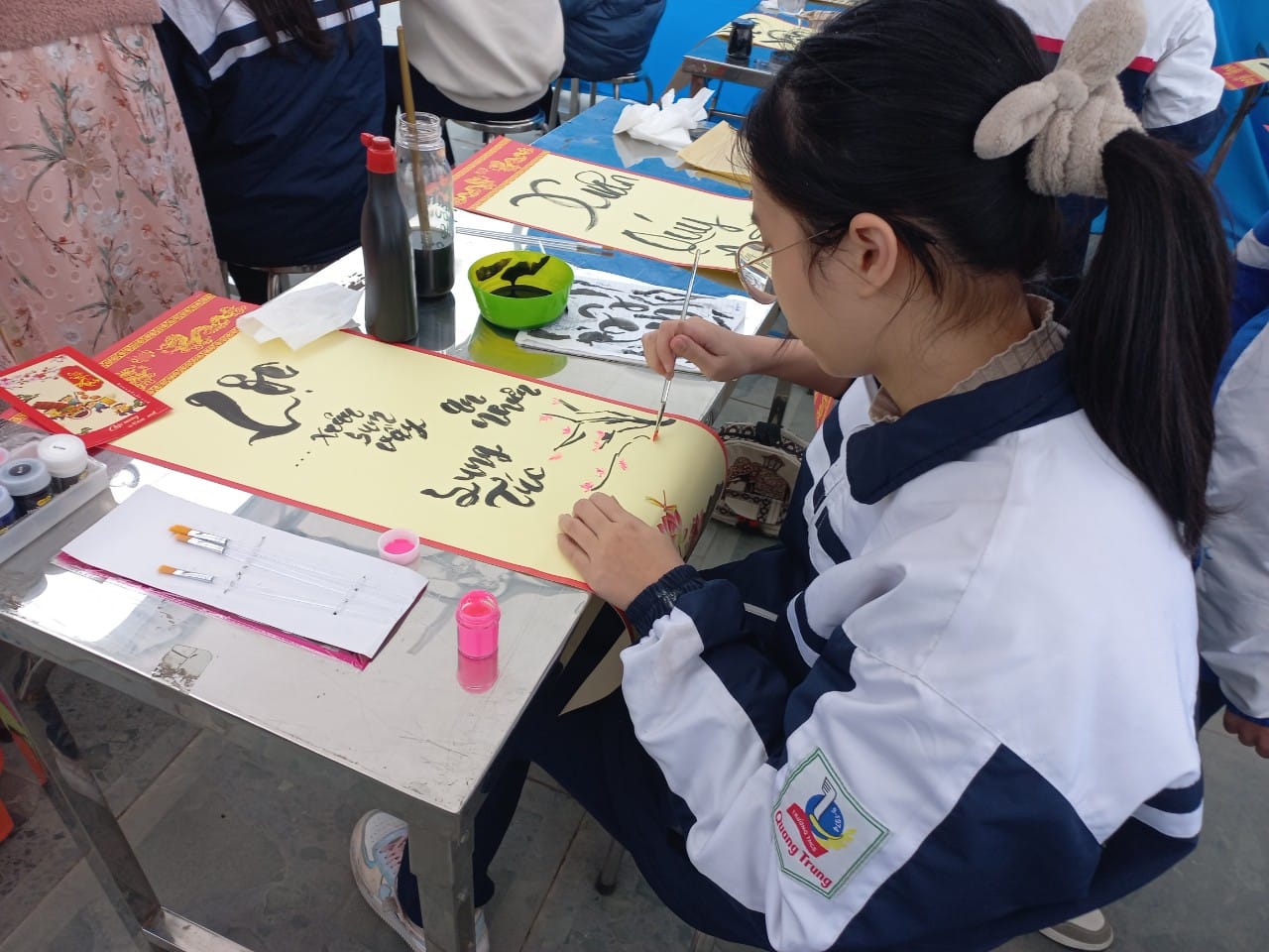 Thí sinh tham gia Cuộc thi “Viết thư pháp” với chủ đề “Lời chúc đầu Xuân” phải chọn một lời chúc Tết gồm ít nhất 4 từ, sau đó thể hiện trên giấy và trang trí phụ họa thêm cho bài thi thư pháp của mình. Cuộc thi được chia thành 02 bảng, theo đó bảng thi dành cho giáo viên có sự tham gia của thầy giáo Nguyễn Minh Khuê và thầy giáo Đặng Ngọc Tân. Bảng thi dành cho học sinh có sự tham gia của học sinh Lương Thị Bạch Diệp, Vũ Tô Ngọc Diệp và Nguyễn Thùy Anh (lớp 9A1). Tại mỗi bảng thi, Ban Tổ chức đã lựa chọn 05 bức thư pháp xuất sắc nhất để trao thưởng.